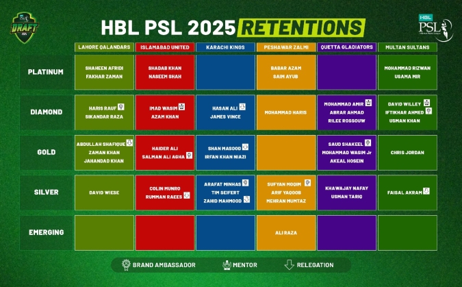 Lahore, 4 January 2025: The six HBL PSL franchises have announced their retentions ahead of the HBL PSL 2025 Players Draft which is scheduled to take place on 11 January.